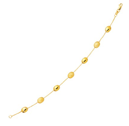 Polished and Textured Pebble Station Bracelet in 14k Yellow Gold Stock Number: 00637 Quite a stylish bracelet designed in lovely 14k yellow gold. Featuring textured and polished pebble stations, this 7 1/4 inches piece is secured with a lobster lock. Price $313.57