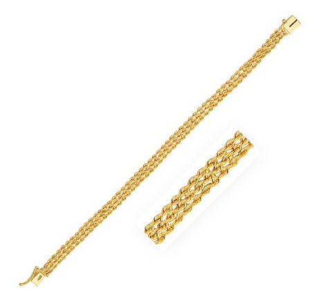 Three Row Rope Bracelet in 14k Yellow Gold (6.0mm) Stock Number: 54758 Three row rope bracelet crafted in 14k yellow gold and measuring 6.0 millimeters in width. Secured with a box catch with snap safety clasp. Size 7" Price $498.81 Size 8" Price $565.50