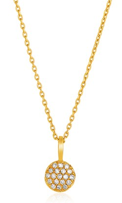 14k Yellow Gold 16 inch Necklace with Gold and Diamond Circle Pendant (1/10 cttw) Stock Number: 23067 This elegant and delicate circle shines in gold and diamonds. 0.7 millimeters round link cable link chain necklace is 16 inches long. Price $516.58