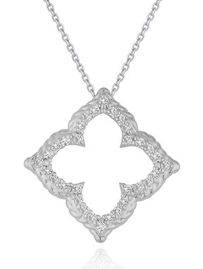 Floral Cut-out Diamond Pendant in 14k White Gold (1/3 cttw) Stock Number: 36436 Featuring a flower-like design with cut-out detailing, this diamond pendant comes with a 16 inches cable chain. Made of 14k white gold and secured with a lobster lock. Price $866.00