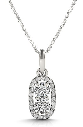 Outer Oval Shaped Two Stone Diamond Pendant in 14k White Gold (5/8 cttw) Stock Number: 33814 This two stone diamond pendant features a border of smaller sparkling side diamonds. An alluring piece made of 14k white gold. Price $1,415.78