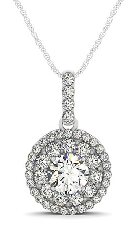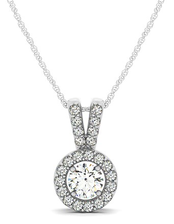 Diamond Halo Pendant in 14k White Gold (5/8 cttw) Stock Number: 47354 Showcasing a 1/2 carat center diamond with a halo of surrounding diamonds, this round pendant is utterly gorgeous. Made of 14k white gold. Price $1,802.78