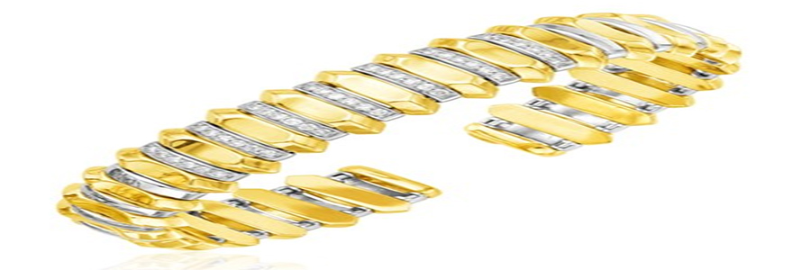 14k Two Tone Gold Cuff Bangle with Polished Bars and Diamonds Stock Number: 75660 Gorgeous polished bars intermingle with opulent rows of diamonds to create this unique, eye-catching 14k yellow and white gold cuff bangle. Bangle is 13.5mm wide. Total weight of diamonds is 0.59ct. Price $2,862.90