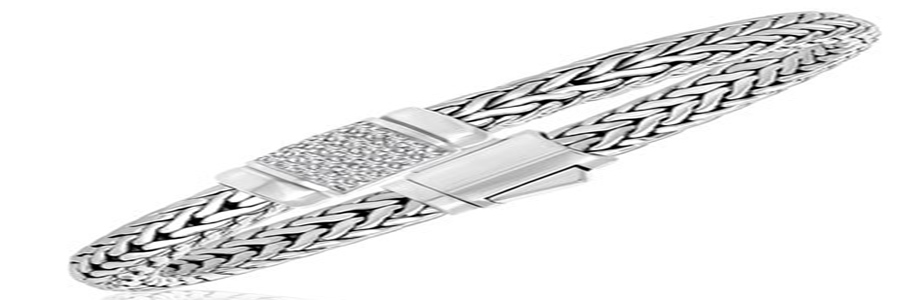 White Sapphire Accented Weave Style Bracelet in Sterling Silver Stock Number: 39277 This is a classy sterling silver bracelet showcasing a lovely weave style chain. Accented with white sapphires, this measures 7 1/2 inches. Price $346.50