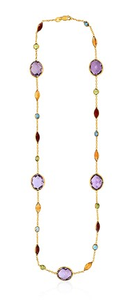 14k Yellow Gold Necklace with Multi-Colored Stones Stock Number: 07776 Like a string of colored lights, this gold chain dazzles with multicolored stones. Necklace is 18 inches long and closes with a lobster clasp. Stones are garnet, citrine, peridot, blue topaz, and amethyst. Price $831.50