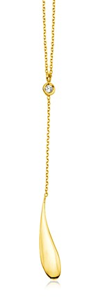 14k Yellow Gold Teardrop Lariat Necklace with Diamond Stock Number: 52669 Like a frozen droplet of water, a shiny drop of polished 14k yellow gold hangs below the single opulent diamond of this fascinating lariat necklace. Necklace is 18 inches long and closes with a lobster clasp. Weight of diamond is .024ct. Price $325.70