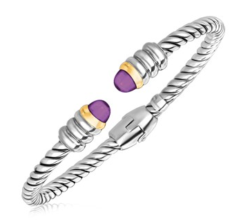 Amethyst Embellished Italian Cable Open Hinged Bangle in 18k Yellow Gold and Sterling Silver Stock Number: 36857 Showcasing ends with round amethysts and polished 18k yellow gold border, this open style Italian cable sterling silver open bangle is an expandable hinged type. Price $420.00
