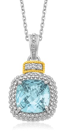 Cushion Sky Blue Topaz and Diamond Accented Popcorn Cushion Pendant in 18k Yellow Gold and Sterling Silver (.02cttw) Stock Number: 34794 A delight to the senses, this cushion sky blue topaz pendant features popcorn border detailing and upper diamond accents. Made of superb 18k yellow gold and sterling silver. Price $270.50