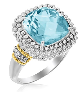 Popcorn Cushion Sky Blue Topaz and Diamond Ring in 18k Yellow Gold and Sterling Silver (.05cttw) Stock Number: 64794 A delightful sky blue topaz is bordered by popcorn like texture on this diamond accented 18k yellow gold and sterling silver ring. Available in sizes 7 to 9. Price $335.00