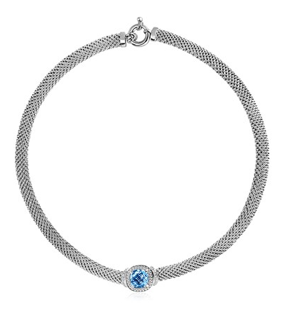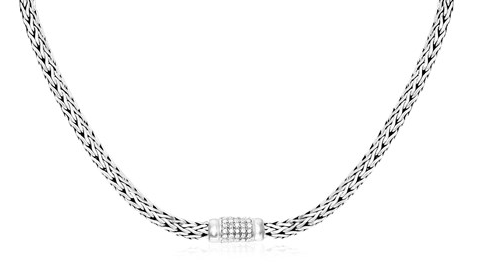 White Sapphire Embellished Woven Chain Necklace in Sterling Silver Stock Number: 06882 A beautifully designed sterling silver woven necklace with a white sapphire accented bar. Available in size 18 inches. Price $486.50