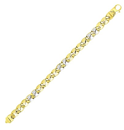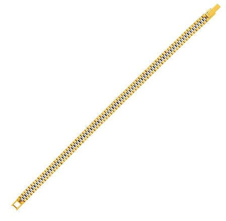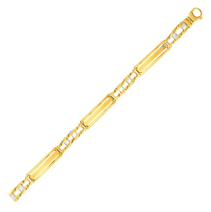 Bar Link Men's Bracelet in 14k Two-Tone Gold Stock Number: 63597 Featuring white tone connectors in a fancy interlinked style, this bar link men's bracelet is designed in 14k two-tone gold. Measures 8 1/4 inches and comes with a lobster clasp. Price Size: 8.25" $922.20