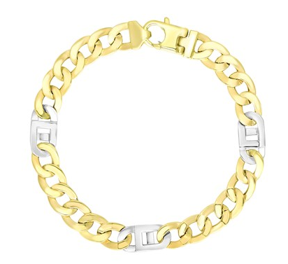 Curb and Mariner Style Link Men's Bracelet in 14k Two-Tone Gold Stock Number: 30060 This 14k two-tone gold men's bracelet features a beautiful curb link with mariner sections. Measures 8 1/2 inches and secured with a lobster lock. Price Size 8.5" $1,485.00
