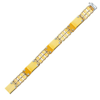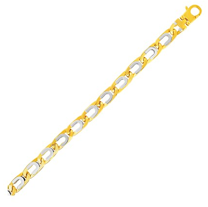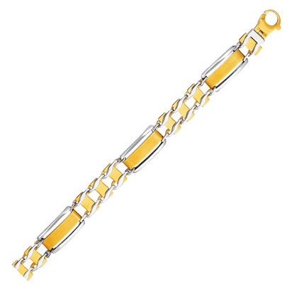 Rounded Bar Links Men's Bracelet in 14k Two-Tone Gold Stock Number: 56164 Showcasing two-tone bar links with rounded corners, this 14k white and yellow gold men's bracelet comes with curved chain connectors. Measures 8 1/2 inches and secured with a lobster lock. Price $1,484.80