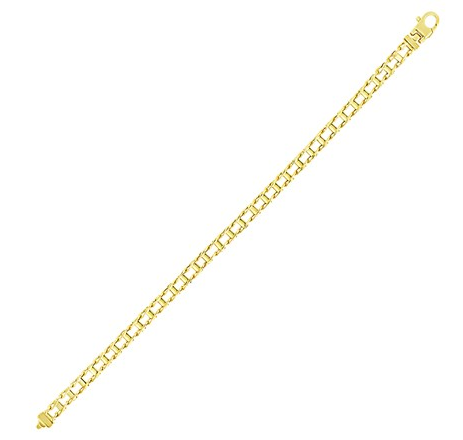Track Design Link Men's Bracelet in 14k Yellow Gold Stock Number: 68573 A lovely men's bracelet with a railroad like design. Made of 14k yellow gold, this measures 8 1/2 inches and is secured with a lobster clasp. Price Size 8.5" $646.70