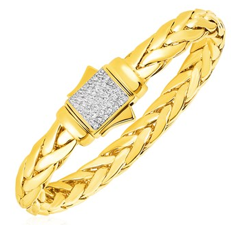 Woven Rope Bracelet with Diamond Accented Clasp in 14k Yellow Gold Stock Number: 35370 This polished, bold bracelet of woven 14k yellow gold features a bold, diamond accented clasp. Bracelet is 8 1/2 inches long and closes with a box clasp. Price Size 8.5" $5,112.50