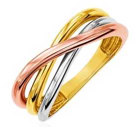 14k Tri Tone Gold Polished Dome Ring Stock Number: 85453 Three distinct bands of polished 14k yellow, white and rose gold twist together beautifully to create this eye-catching, sophisticated ring. Ring Size 7 Price $656.68, Size 8 Price $745.00, Size 9 Price $845.00.