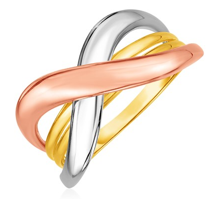 14k Tri color Gold Crossover Ring Stock Number: 87049 A lovely crossover pattern rendered in 14k yellow, white, and rose gold adds shape and contrasting color to this gorgeous ring. Ring is size 7. Price $390.75