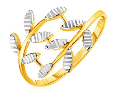 14k Two Tone Gold Crossover Ring with Textured Leaves Stock Number: 77289 Delicate, textured white gold leaves contrast and combine beautifully with this delicate 14k yellow gold crossover ring. Ring size 7. Price $272.00