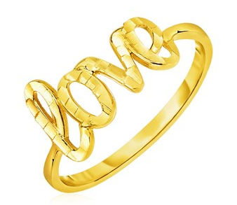 14k Yellow Gold Ring with Love Stock Number: 70654 A lasting reminder of a lasting love, this heartfelt 14k yellow ring says "love" always. Ring size 7. Price $150.98