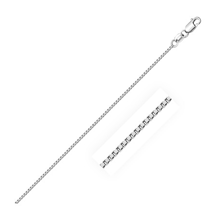Sterling Silver Rhodium Plated Box Chain (1.1 mm) Stock Number: 76778 Rhodium plated box chain crafted in sterling silver measuring 1.1 millimeters in width. Available in lengths 16 inches, 18 inches, 20 inches and 24 inches.