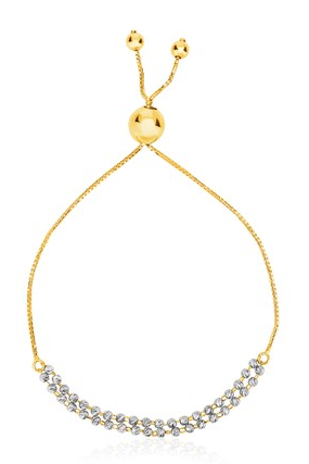 14k TwoTone Yellow and White Gold Adjustable Textured Bracelet Stock Number: 00364 Gold and white gold combine beautifully in this delicate bracelet featuring diamond cut textures. Adjustable bracelet is 9 1/4 inches long and closes with a draw string clasp. Price $313.90