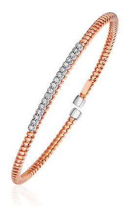 14k Rose and Diamond Domed Light Bangle Bracelet with Clasp Stock Number: 25058 Diamonds surrounded by white gold give this classic, light gold bracelet a touch of sparkle. Bracelet has a circumference of 7 inches and a box clasp closure. Price $1,180.00