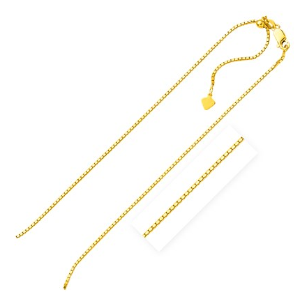 Adjustable Box Chain in Yellow Finish Sterling Silver (1.4mm) Stock Number: 00897 Adjustable box chain crafted in yellow finish sterling silver measuring 1.4 millimeters in width and featuring a heart dangle accent. Adjustable up to 22 inches in length and secured with a lobster clasp.